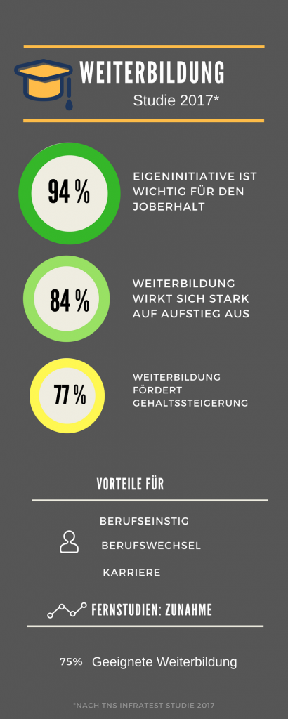 Weiterbildungen und Fortbildungsmaßnahmen werden immer wichtiger. Wer Karriere machen und im Job stetig weiterkommen möchte, für den stehen regelmäßige Weiterbildungen auf dem Plan. Eine Studie von TNS Infratest 2017 belegt: Personalentscheider achten stark auf Weiterbildungen und Eigeninitiative. Außerdem spielt das selbstorganisierte Lernen eine immer größere Rolle. Durch Fernseminare oder im Mix verschiedener Lernmethoden.